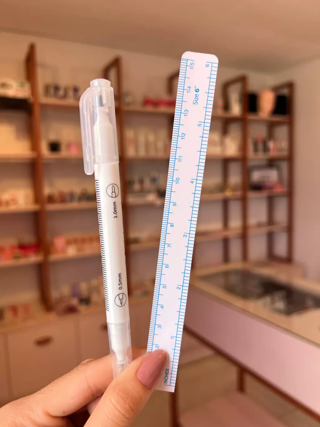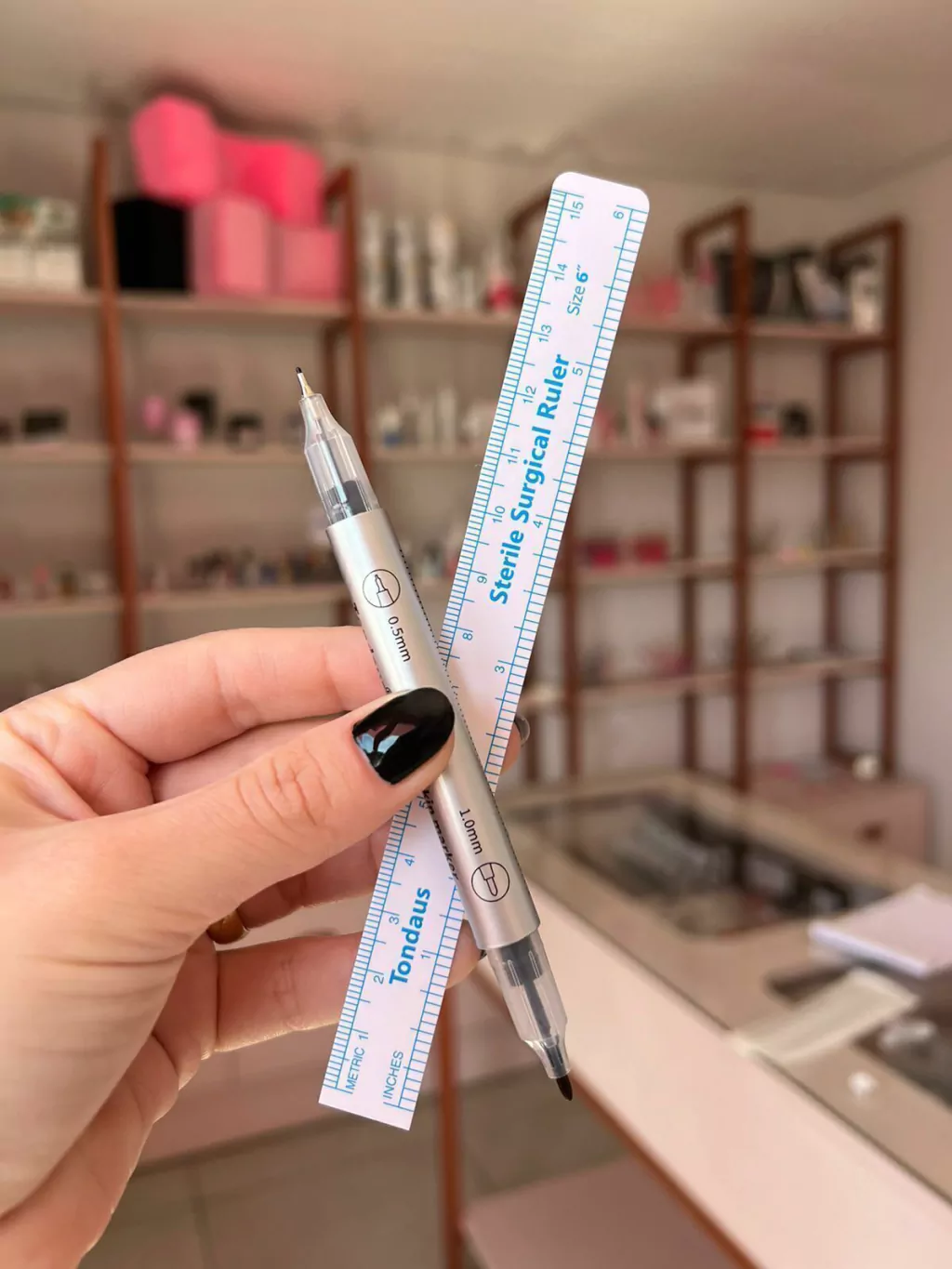 Caneta cirurgica para marcação nos pads com ponta dupla (sendo uma de 0.5mm e outra de 1.0mm) acompanha reguá