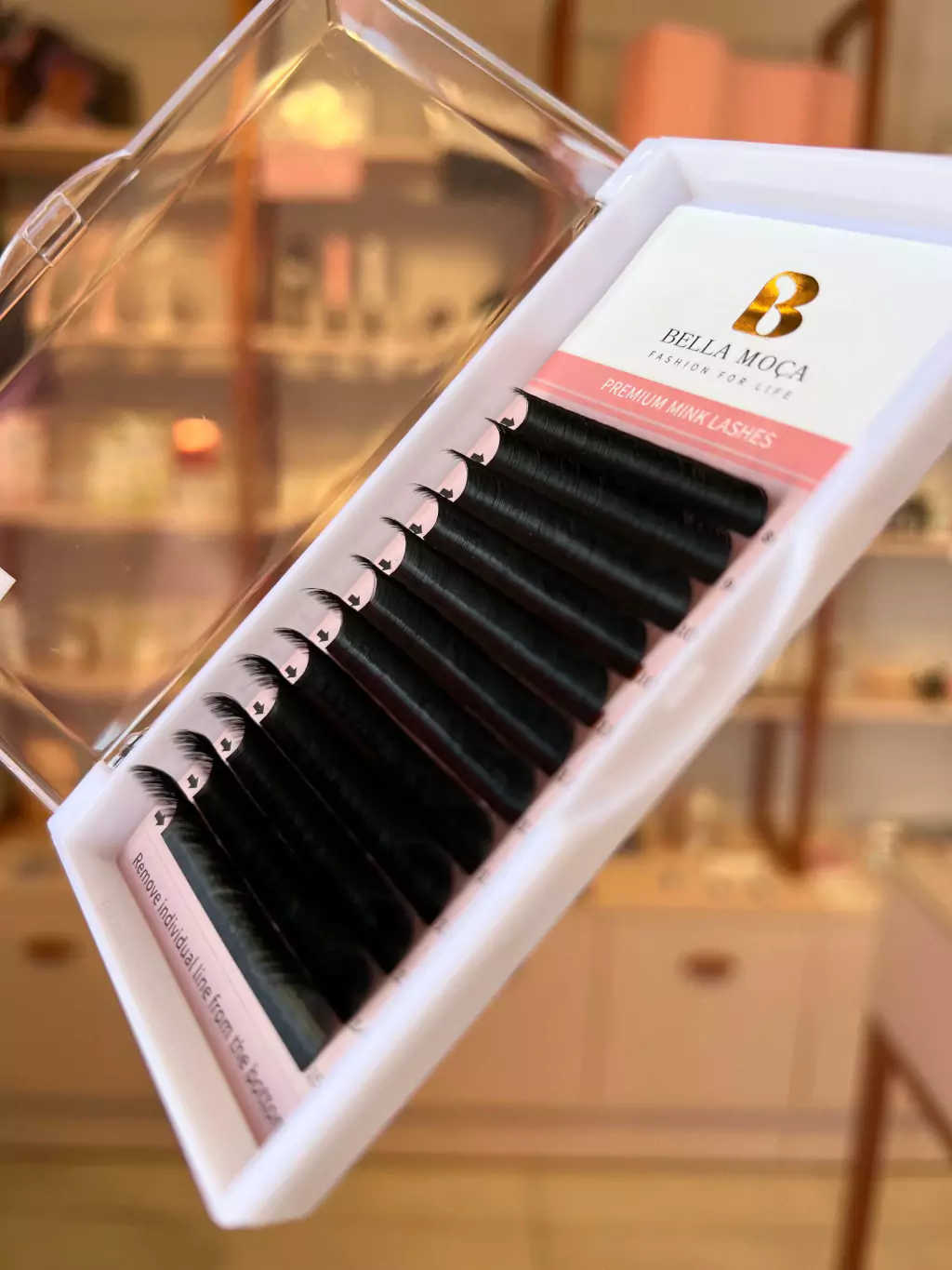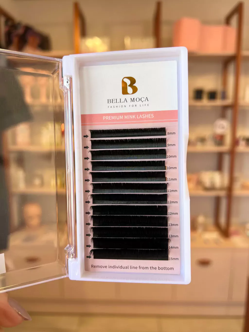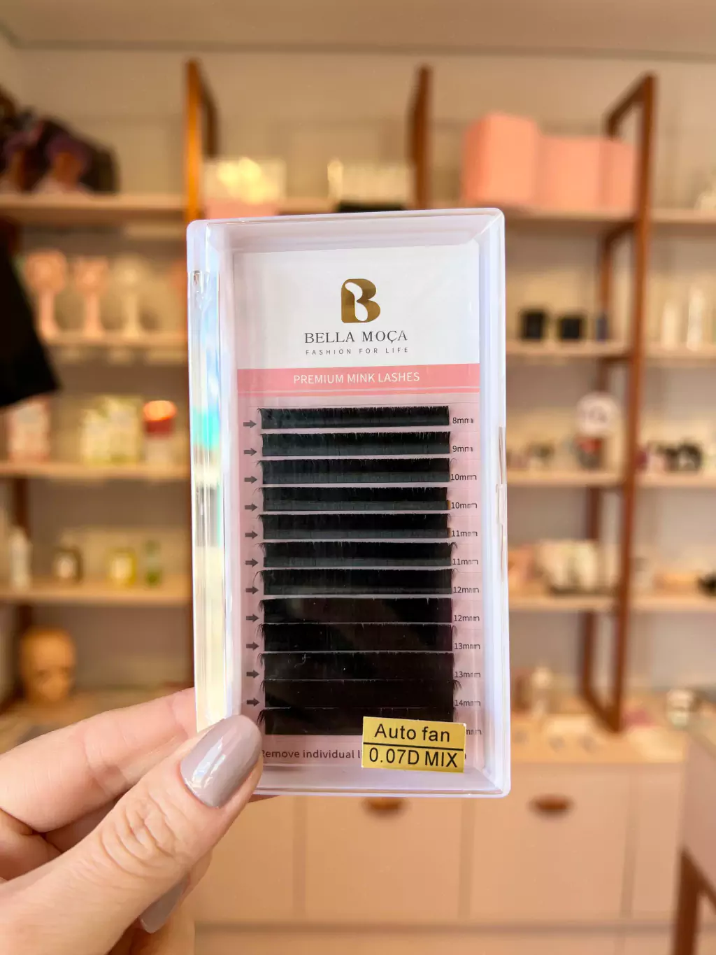 Os cílios Auto Fan possuem uma pequena ligação na base do chicote que auxilia a montagem de seus Fans de forma muito mais fácil e prático, proporcionando agilidade na abertura do Fan e colocação.