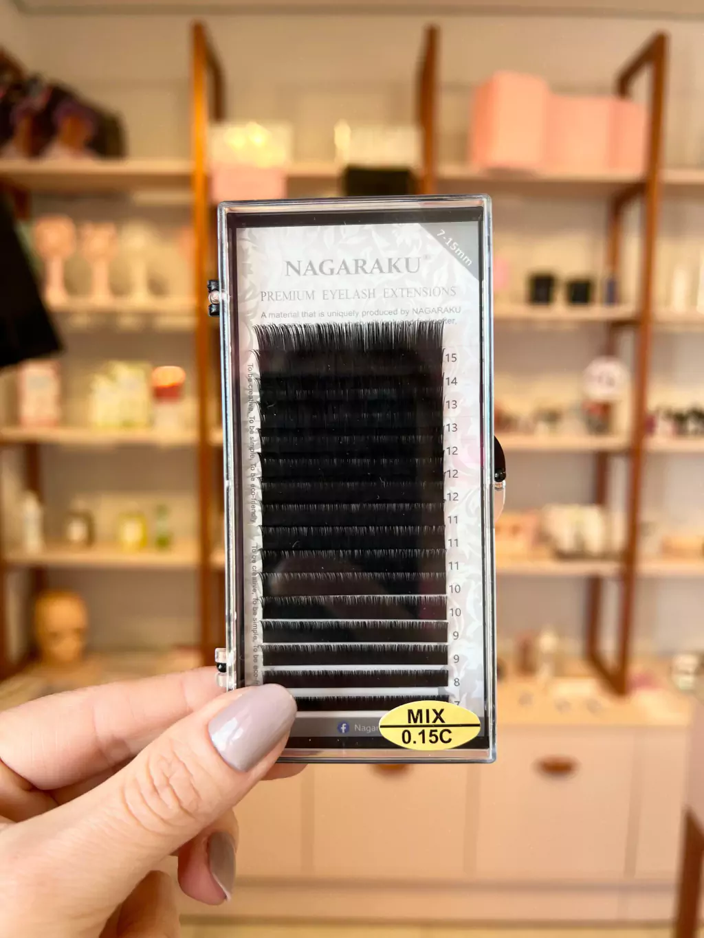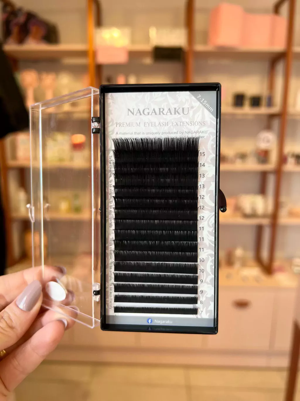 Cílios Nagaraku para a técnica fio a fio clássico (não é ellipse) fio mais firme, para um efeito mais natural. Não é adequado para montagem de fans, apenas para fio a fio.