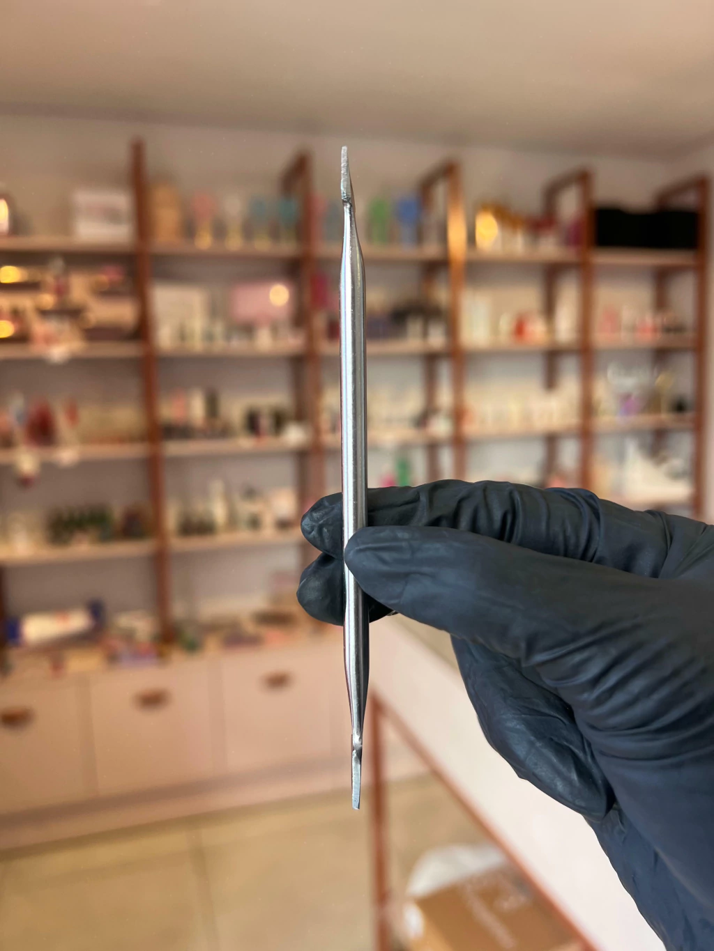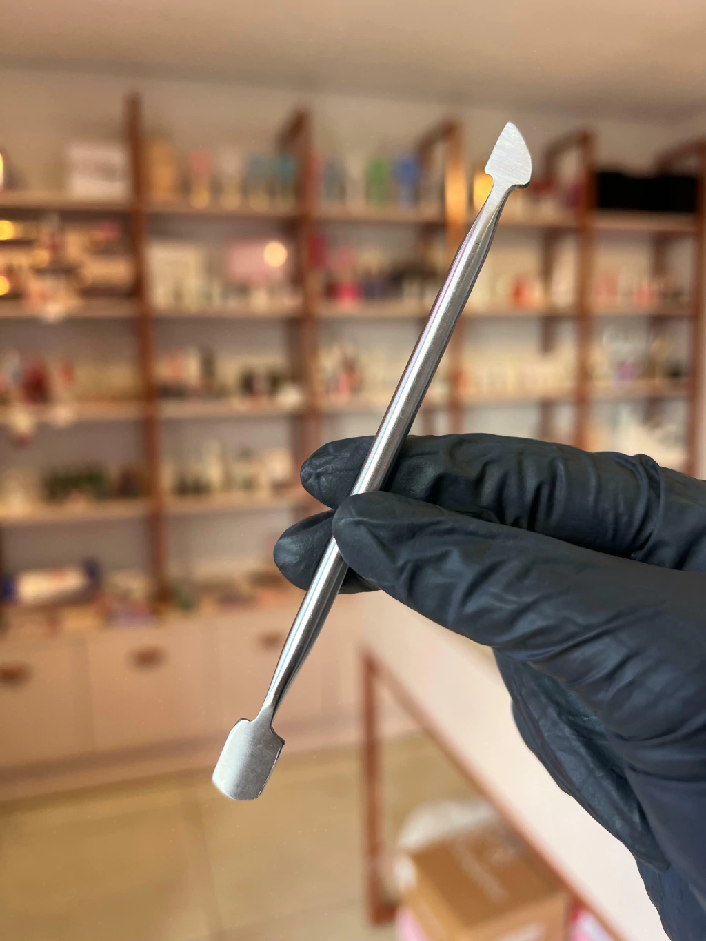 A espátula para unhas serve para empurrar e raspar as cutículas, além de limpar as unhas.