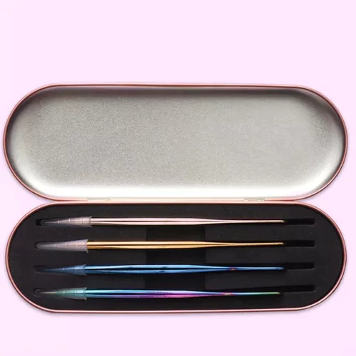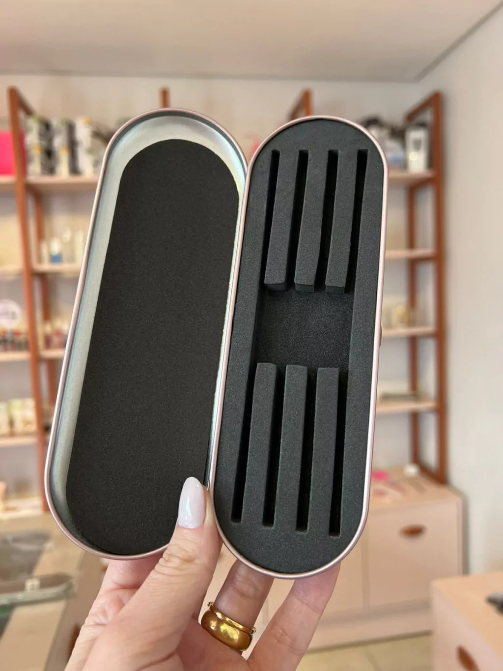 Estojo para pinças é a ferramenta ideal para armazenar suas pinças de extensão de cílios ou de sobrancelhas.CaracterísticasMaterial: MetalTamanho: 17.5x6x2 cmFunção: armazenamento de pinças e quais quer outras ferramentas do tipo.