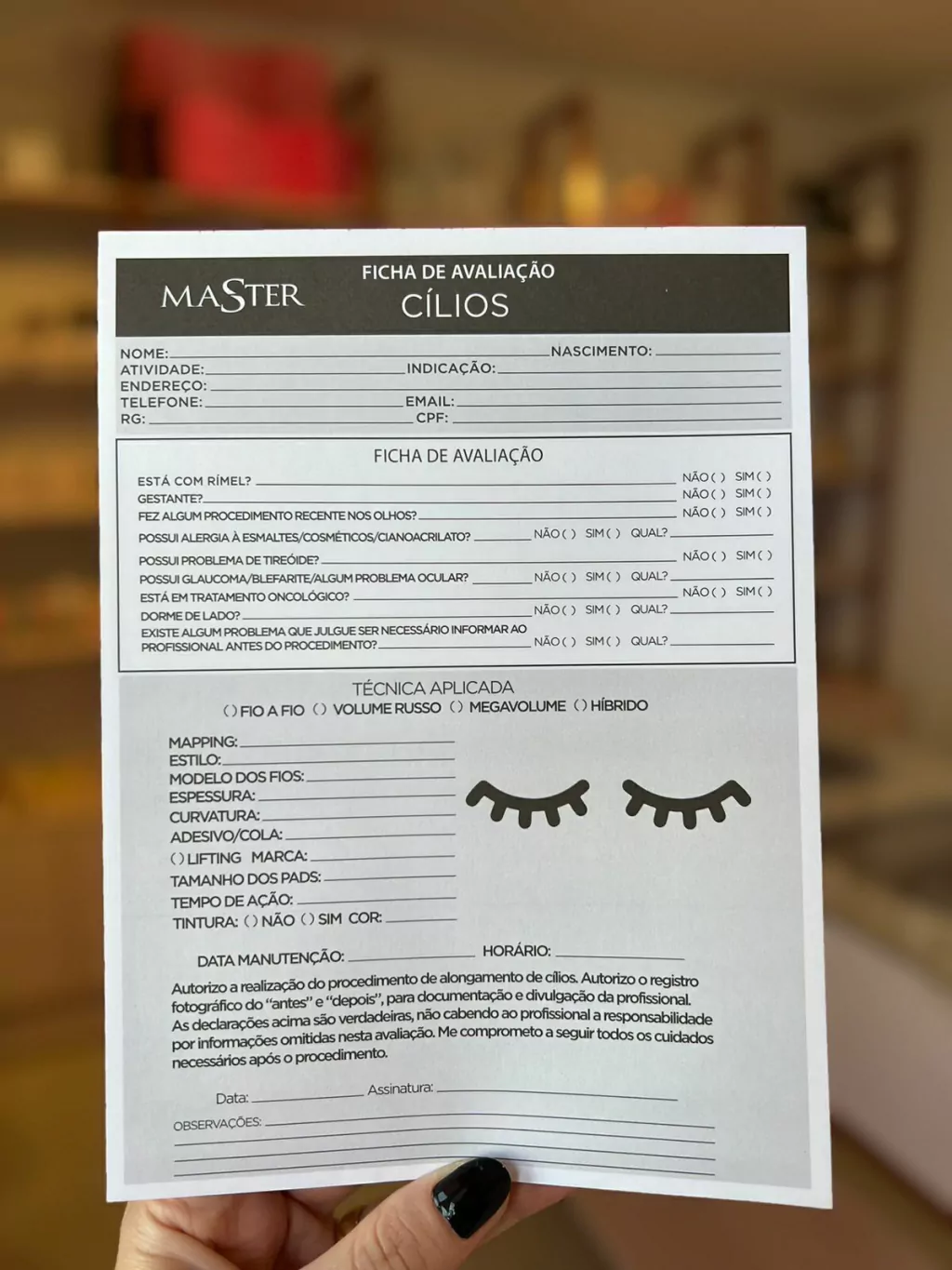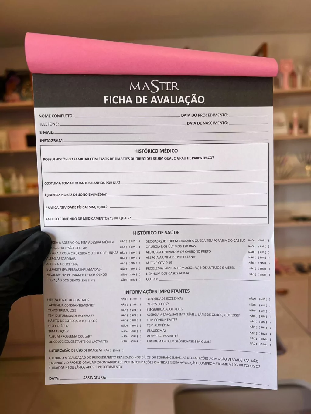A ficha de avaliação é um formulário que será preenchido por sua cliente antes do atendimento para que possa tomar conhecimento de informações extremamente importantes como: pré existência de alergias, sensibilidade, doenças e autorização de uso da imagem.