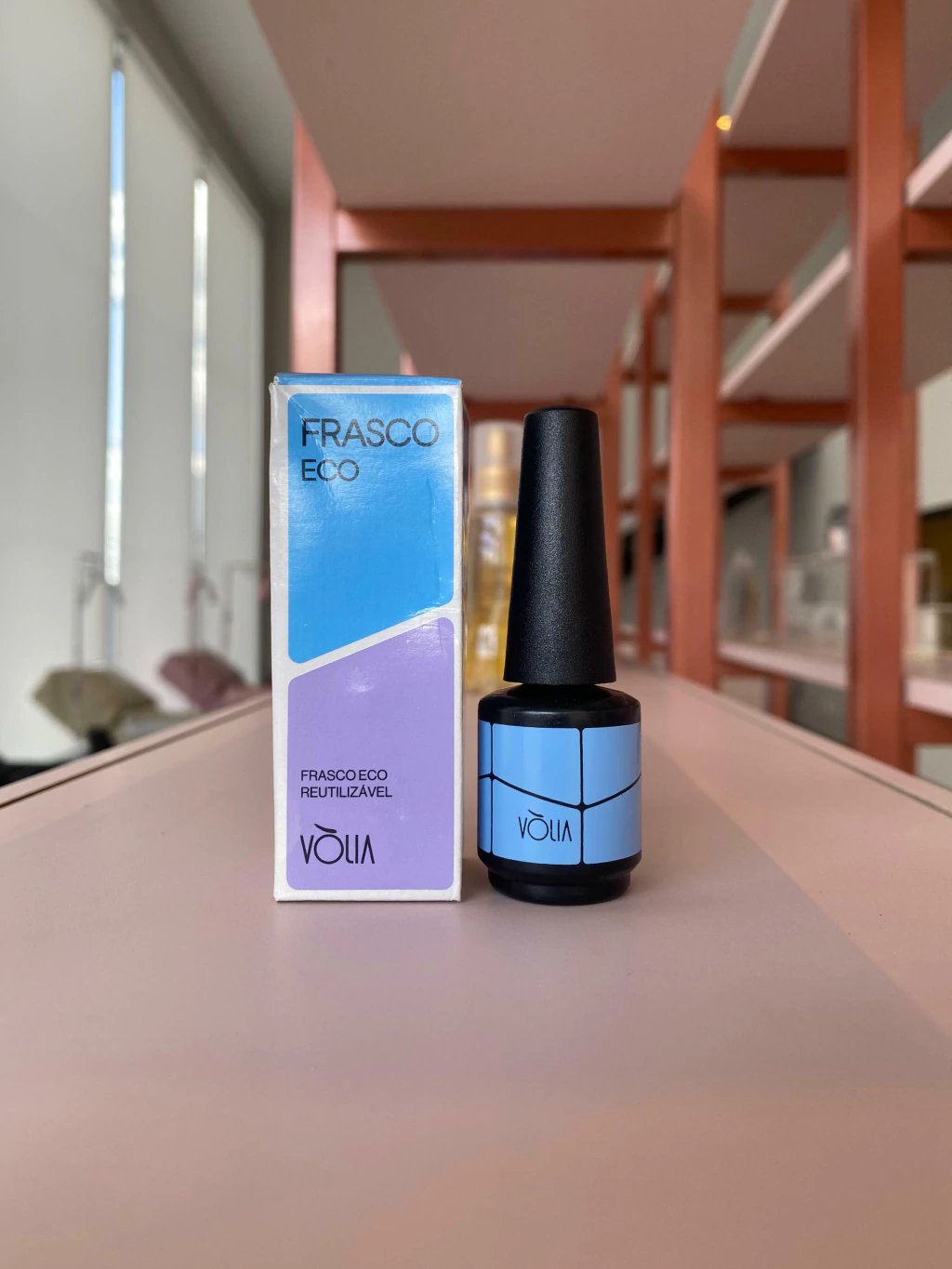 Frasco Silk com proteção UV para colocação de produtos da Linha Vòlia. O Frasco Silk Azul possui um pincel com cerdas menores, ideal para aplicação do Gel Base Vòlia.