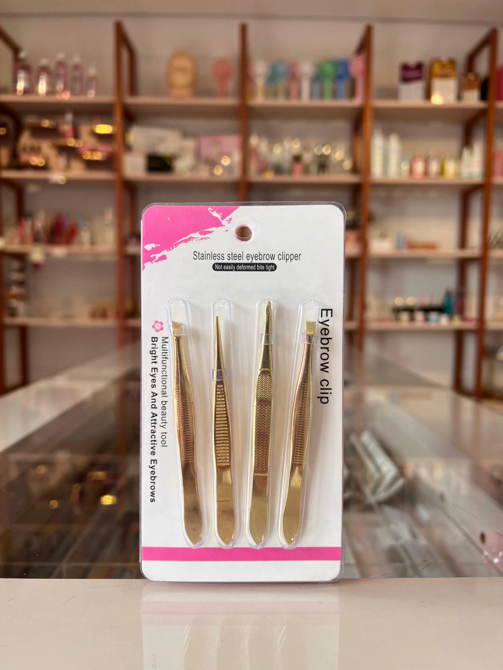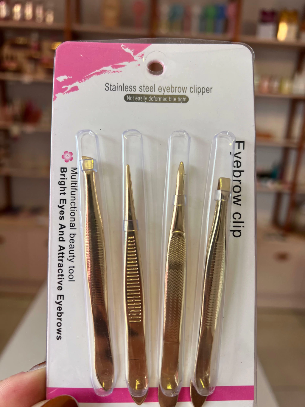 Kit com 4 pinças para sobrancelhas, com ponta reta, chanfrada agulha e semi chanfrada.