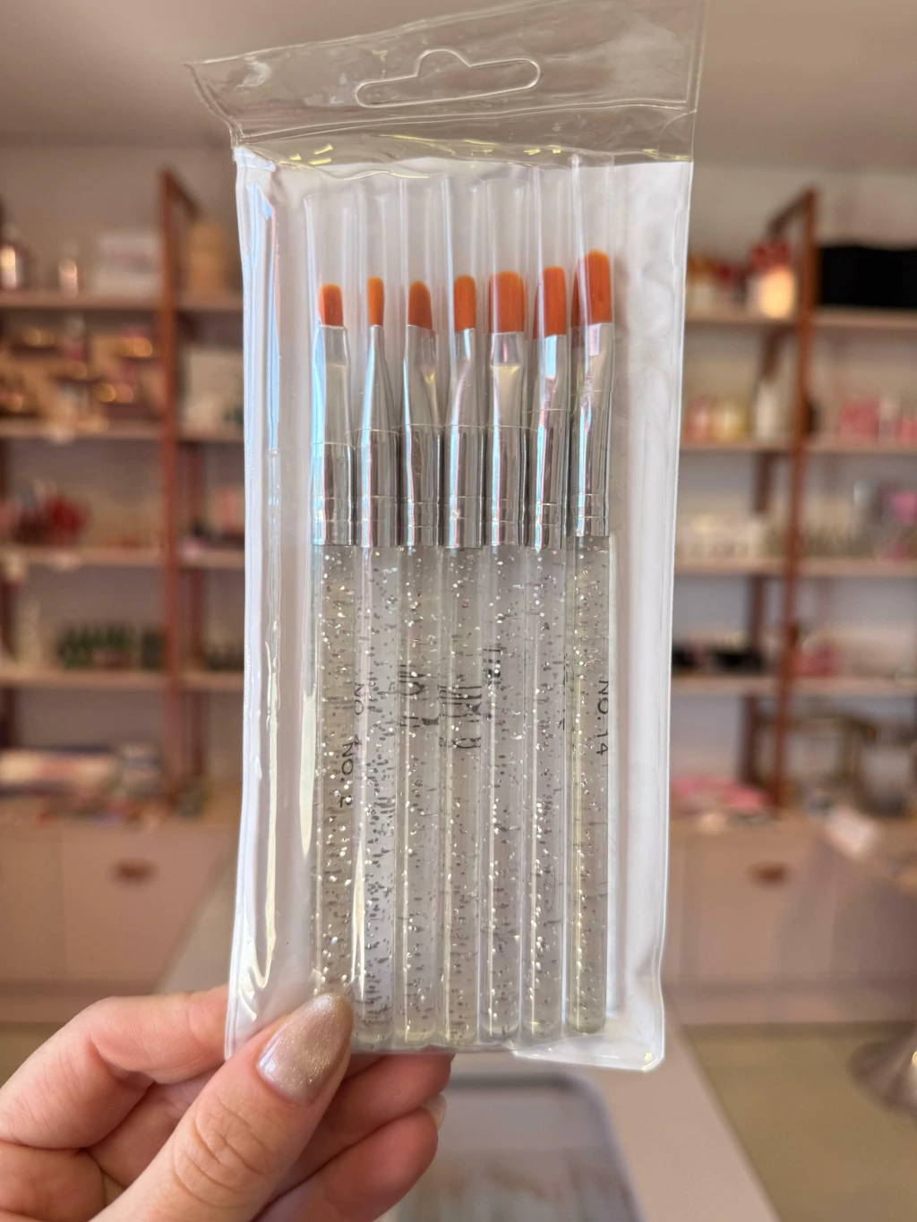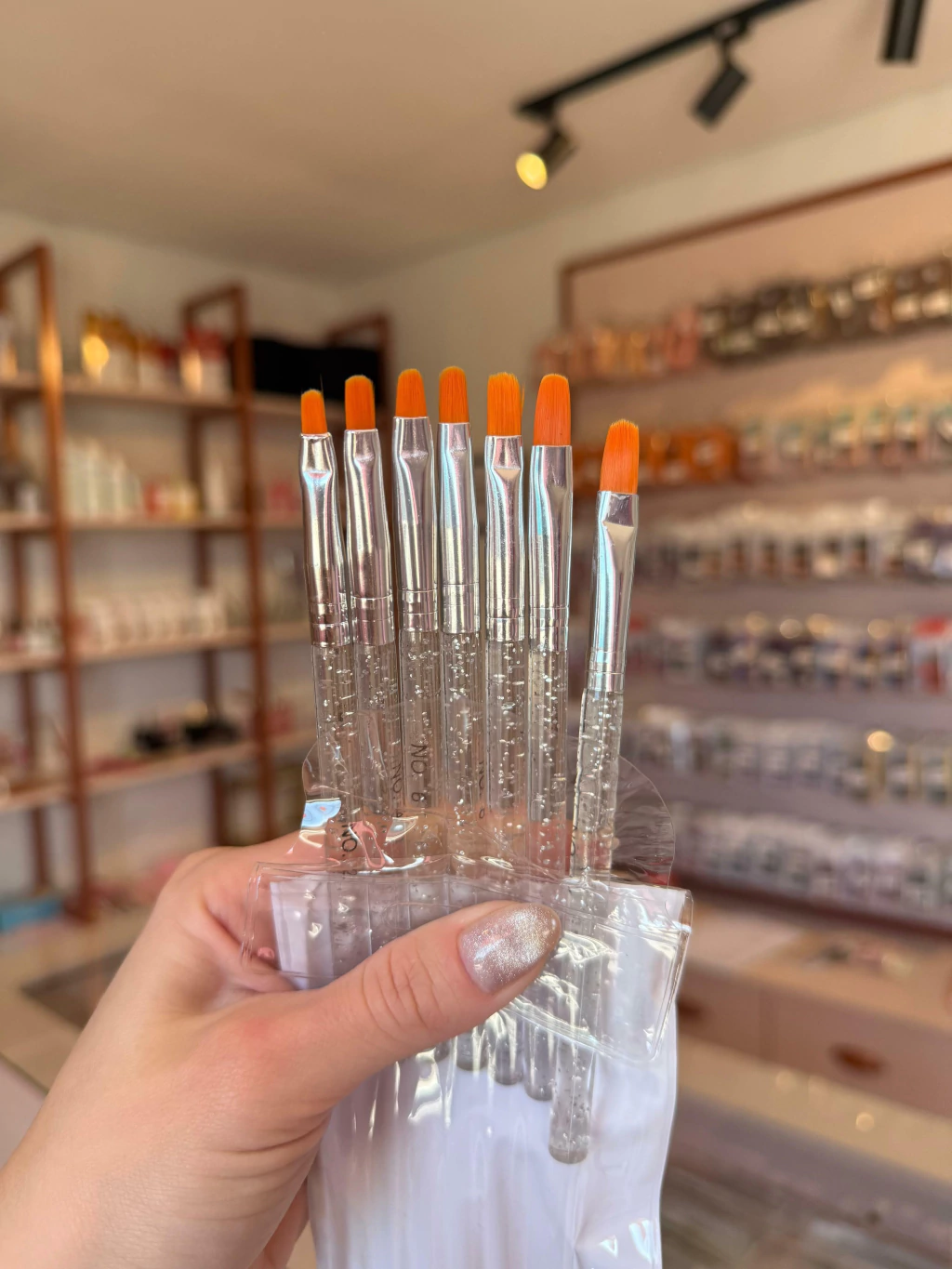 Kit com 7 pinceis de tamanhos variados. Ideal para a aplicação e modelagem de unhas em gel, é utilizado por profissionais que trabalham com alongamento de unhas em gel e acrigel.