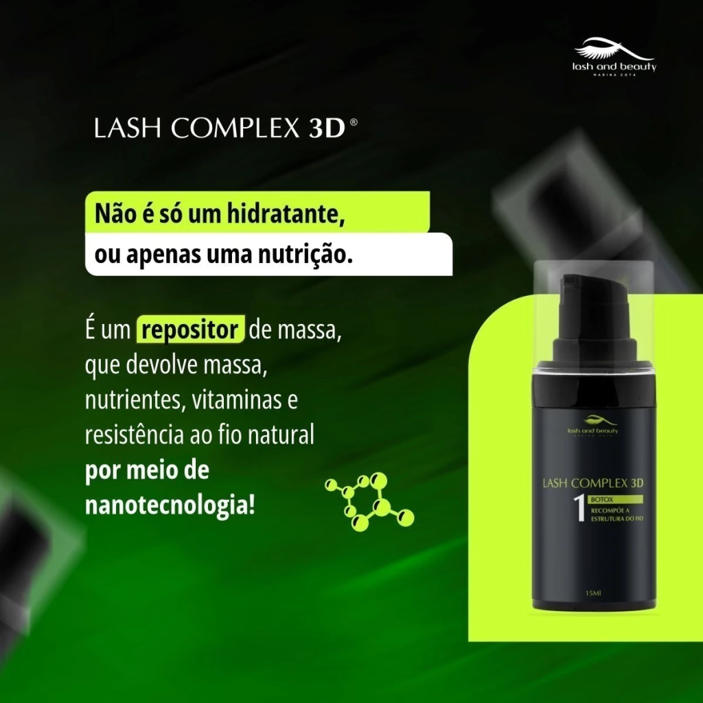 A composição do LASH COMPLEX 3D garante reposição total da massa dos fios fracos ou danificados e garante em até 40% o aumento da espessura dos fios. Como estrela principal o complex conta com força regenerativa da Rosa de Jericó. Conhecida como a Flor da ressureição, que auxília na reconstrução da estrutura do fio por possuir alto teor de absorção de umidade