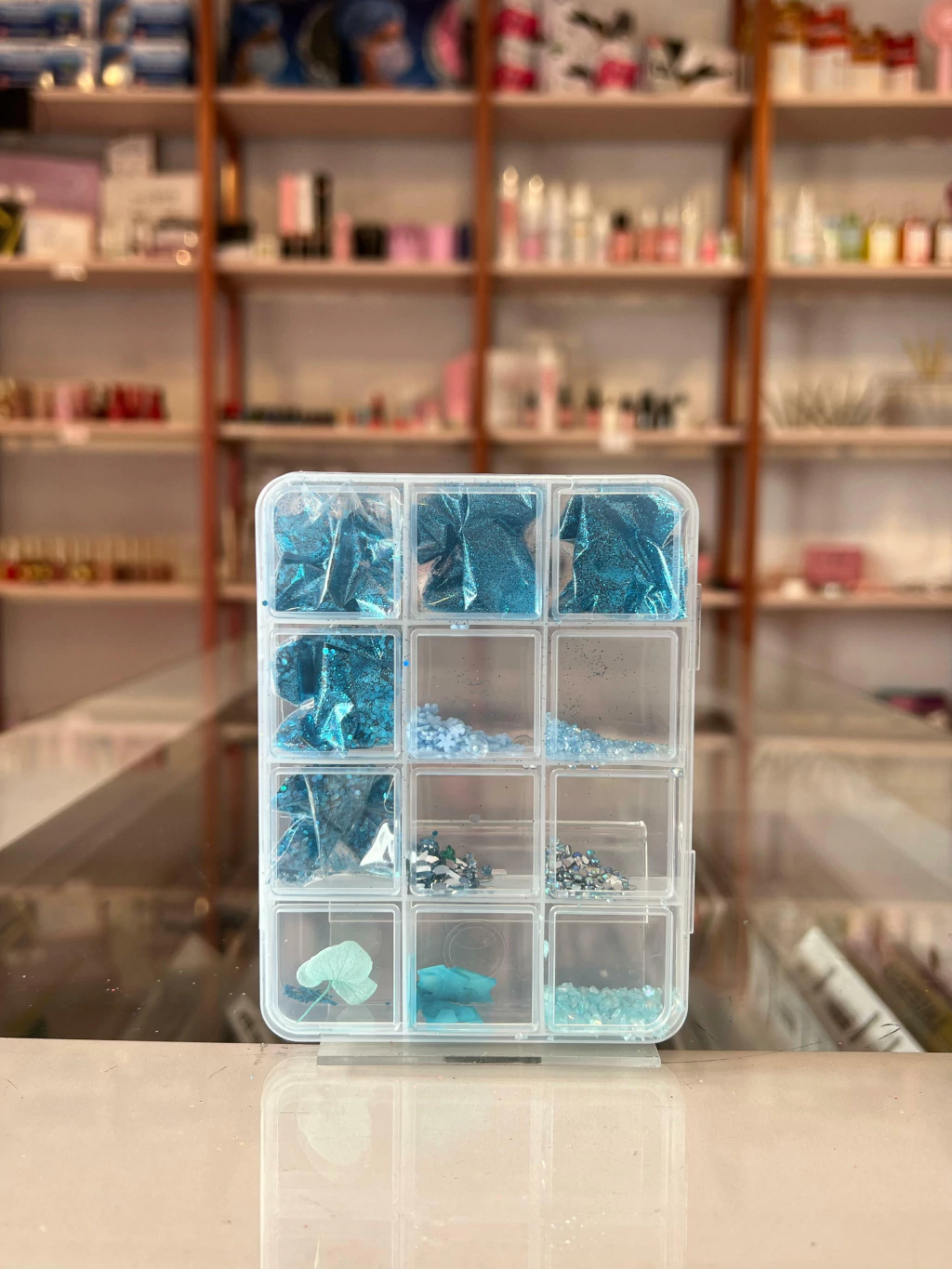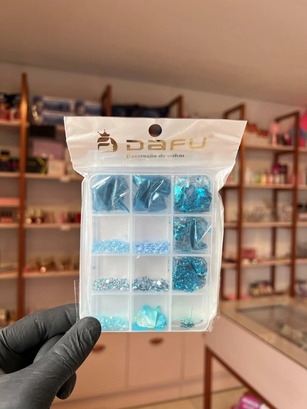 Kit composto por Stass, pedrinha, madreperola e flor seca todos na tonalidade azul. Para deixar um lindo acabamento!