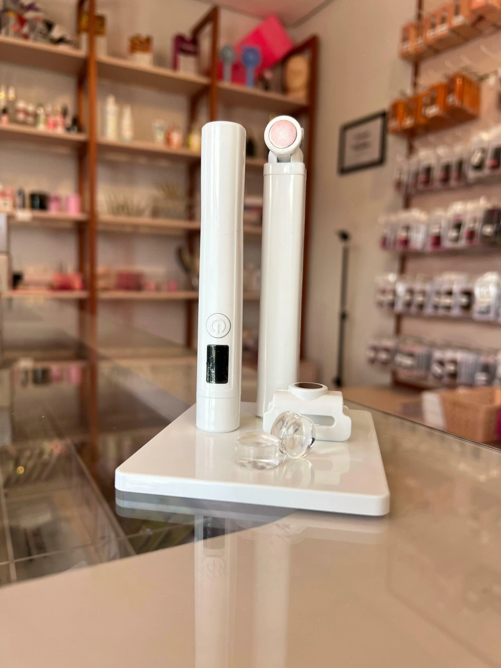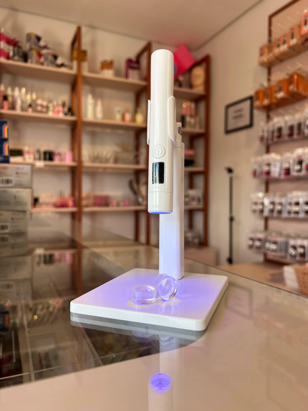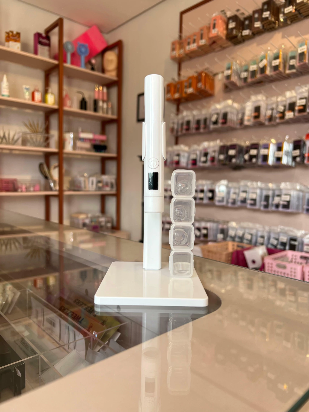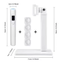 Possui um visor digital para exibição da bateria e contador de segundos. Acompanha 4 carimbos para alocar à ponta da lanterna.