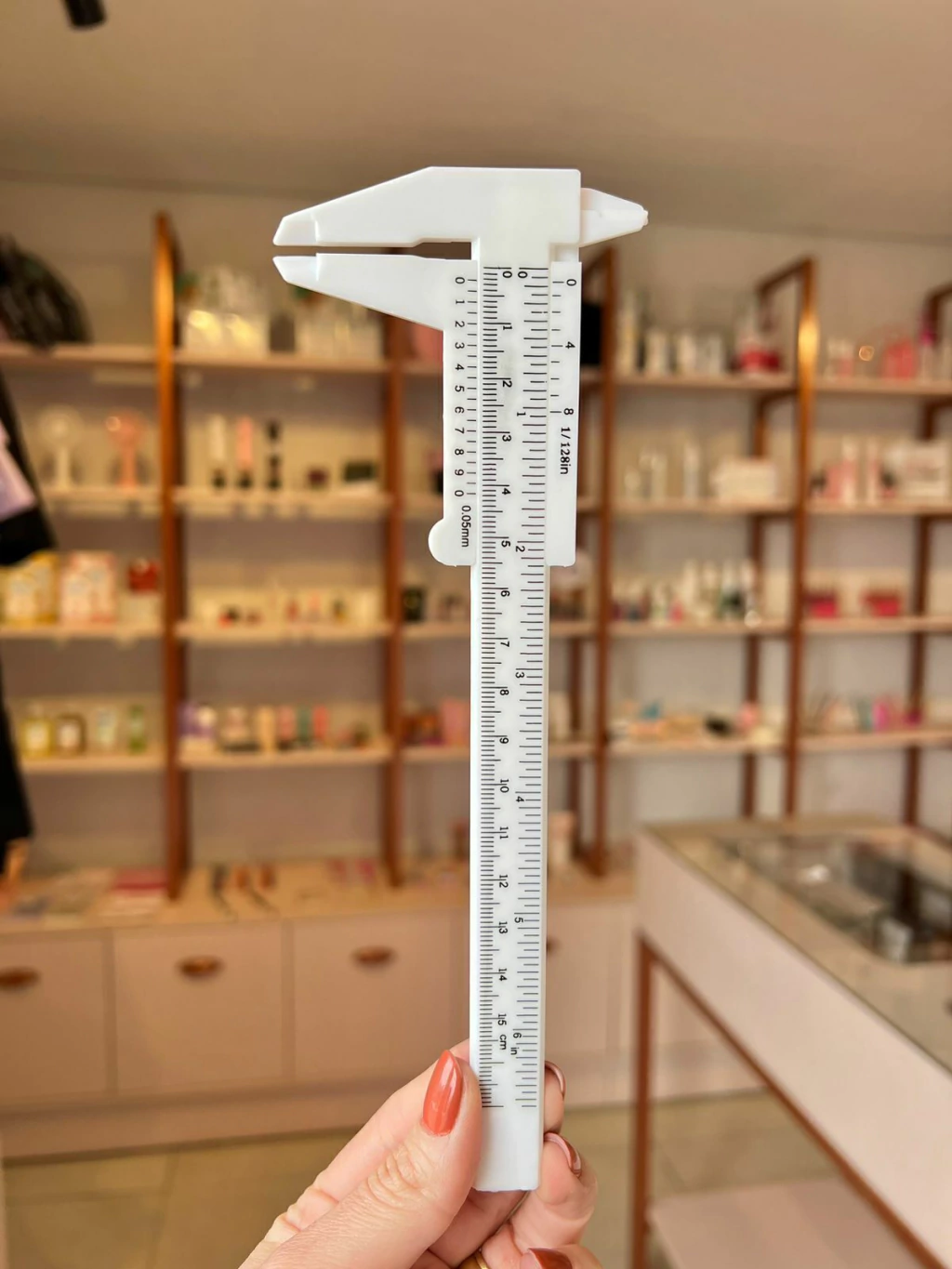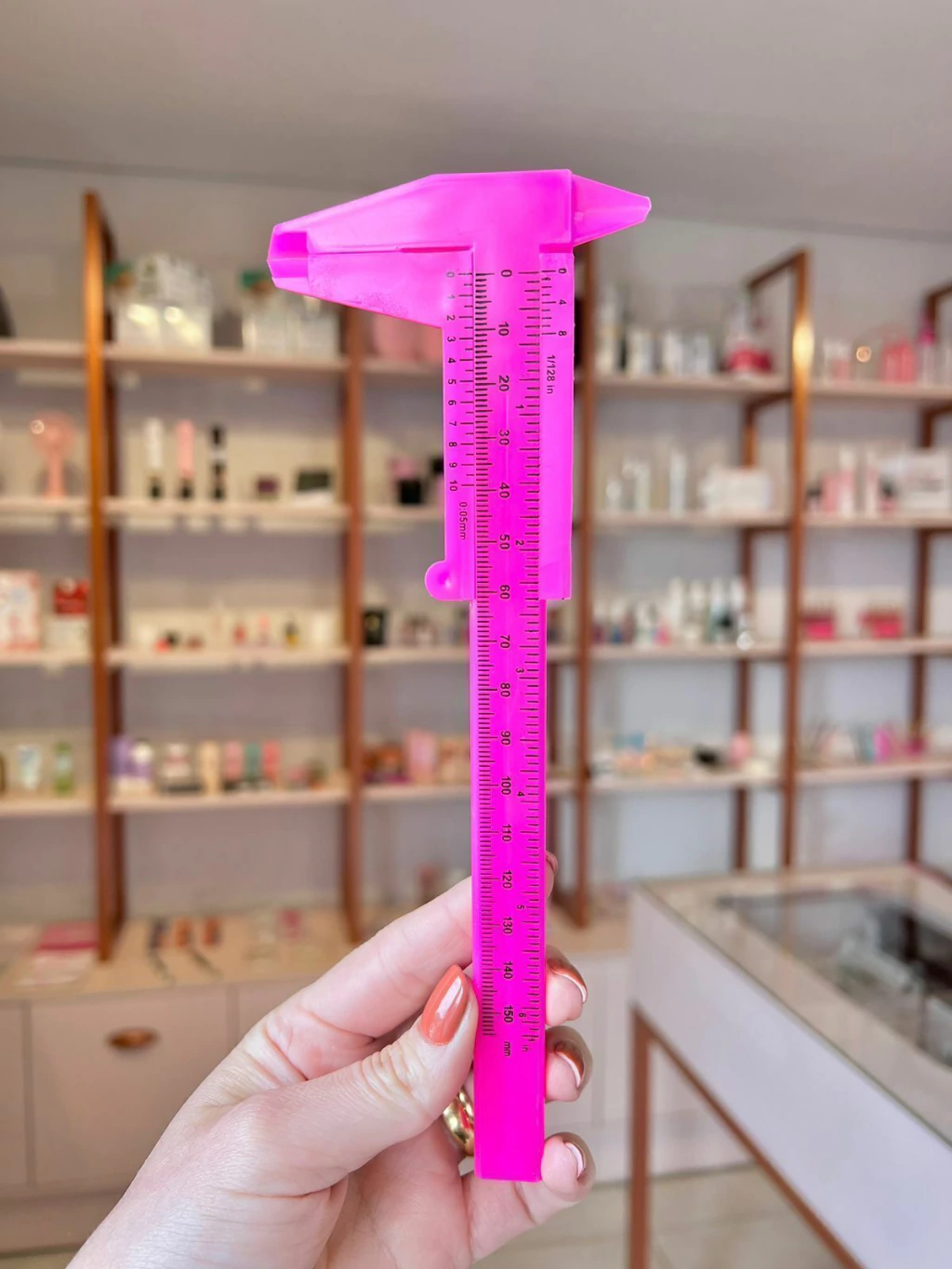 O Paquímetro é um instrumento de uso profissional para Designers de Sobrancelhas indicado para delimitar perfeitamente as sobrancelhas e deixa-las simétricas. Trata-se de uma régua graduada, com encosto fixo, sobre a qual desliza um cursor. Possui dois bicos de medição, sendo um ligado à escala e o outro ao cursor.
