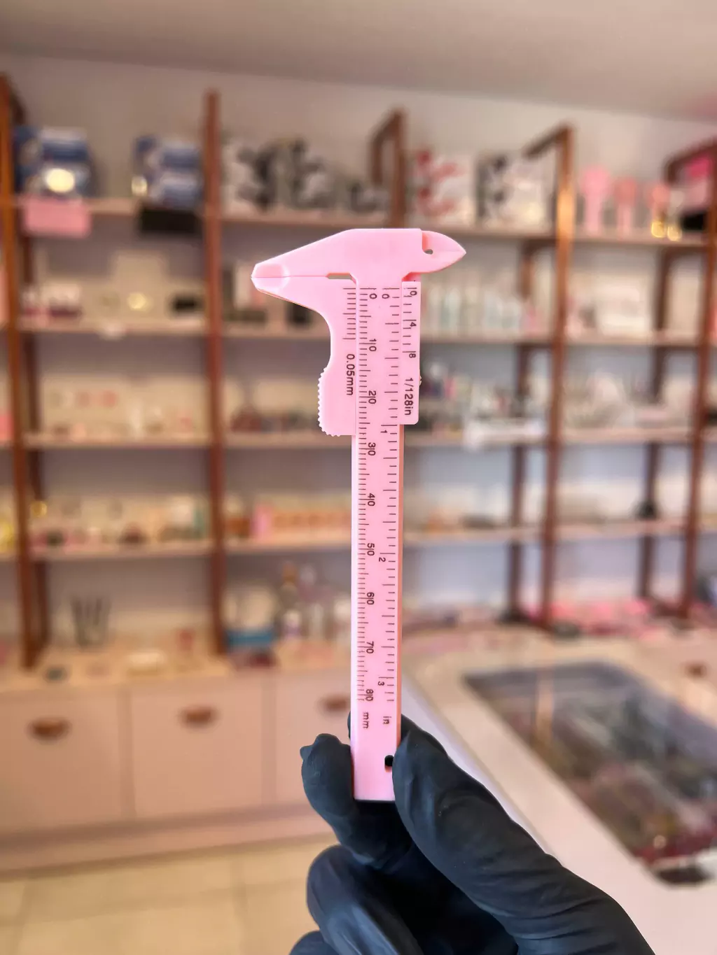 O Paquímetro é um instrumento de uso profissional para Designers de Sobrancelhas indicado para delimitar perfeitamente as sobrancelhas e deixa-las simétricas. Trata-se de uma régua graduada, com encosto fixo, sobre a qual desliza um cursor. Possui dois bicos de medição, sendo um ligado à escala e o outro ao cursor.