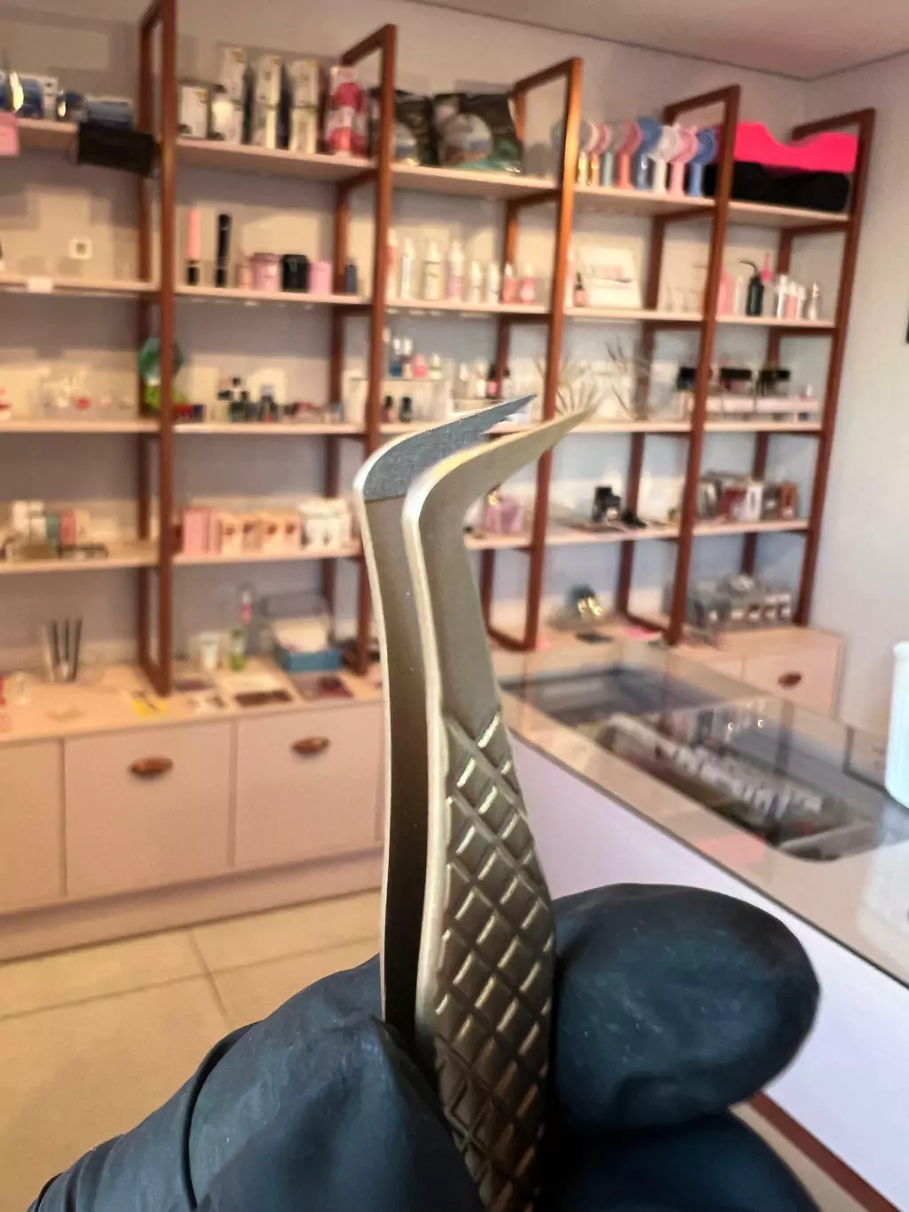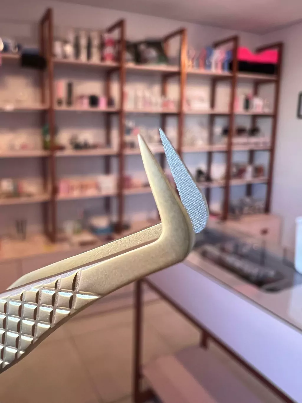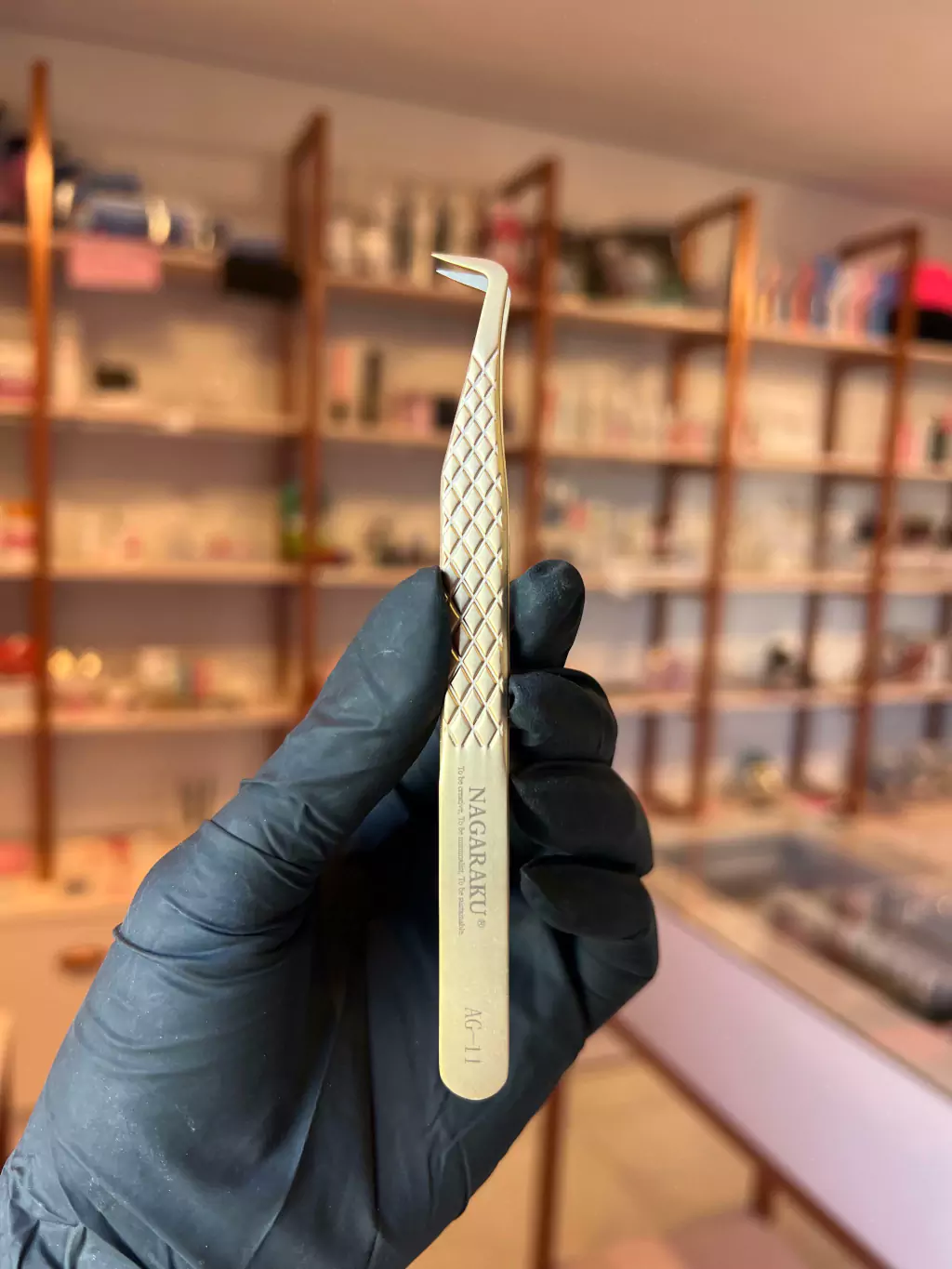 Pinça com a ponta diamantada, não deixa o fio escorregar e ajuda na montagem de fans (indicada para volume russo).