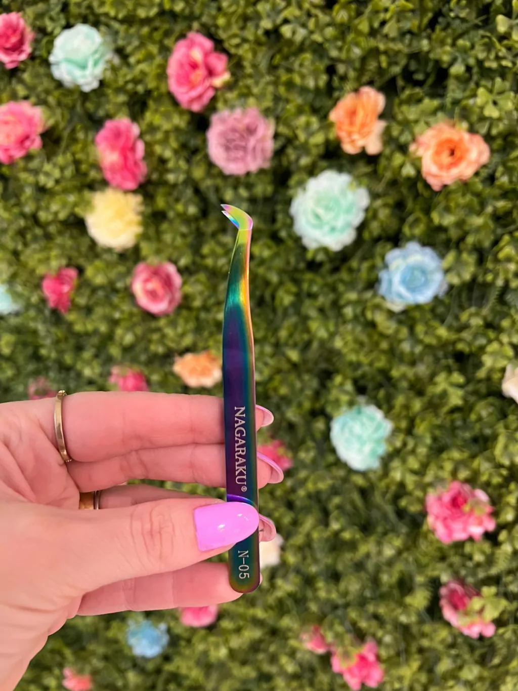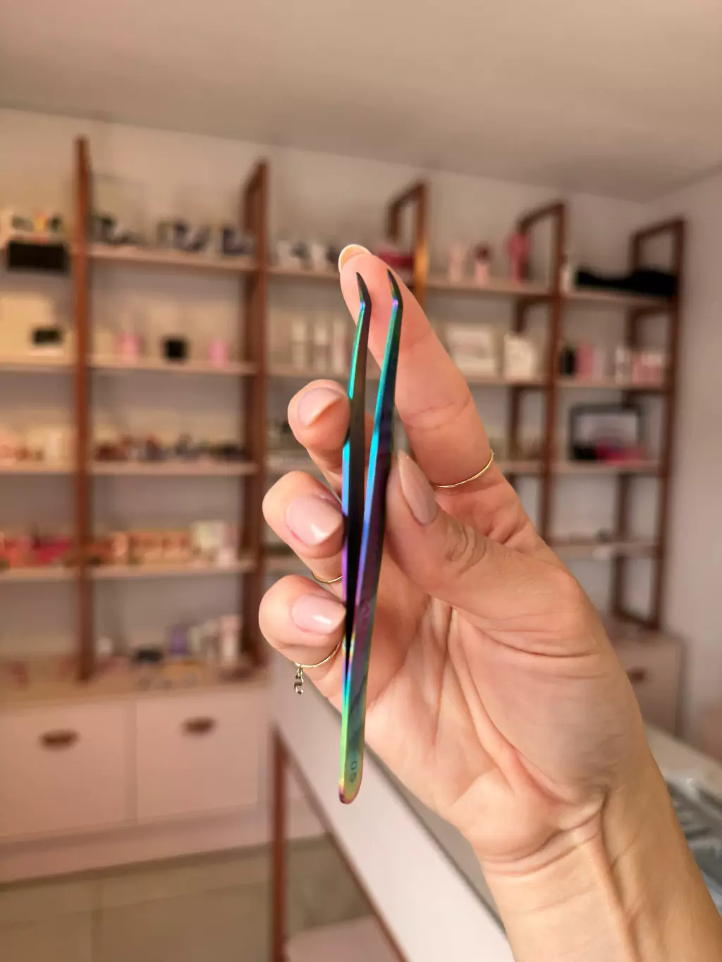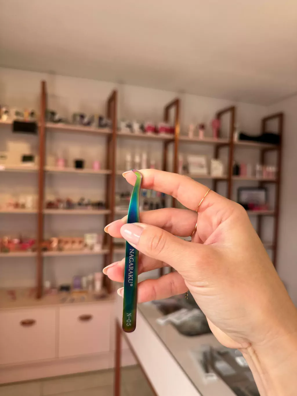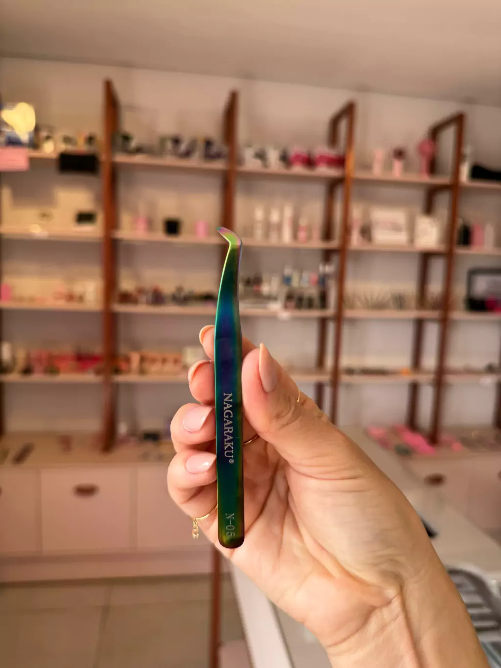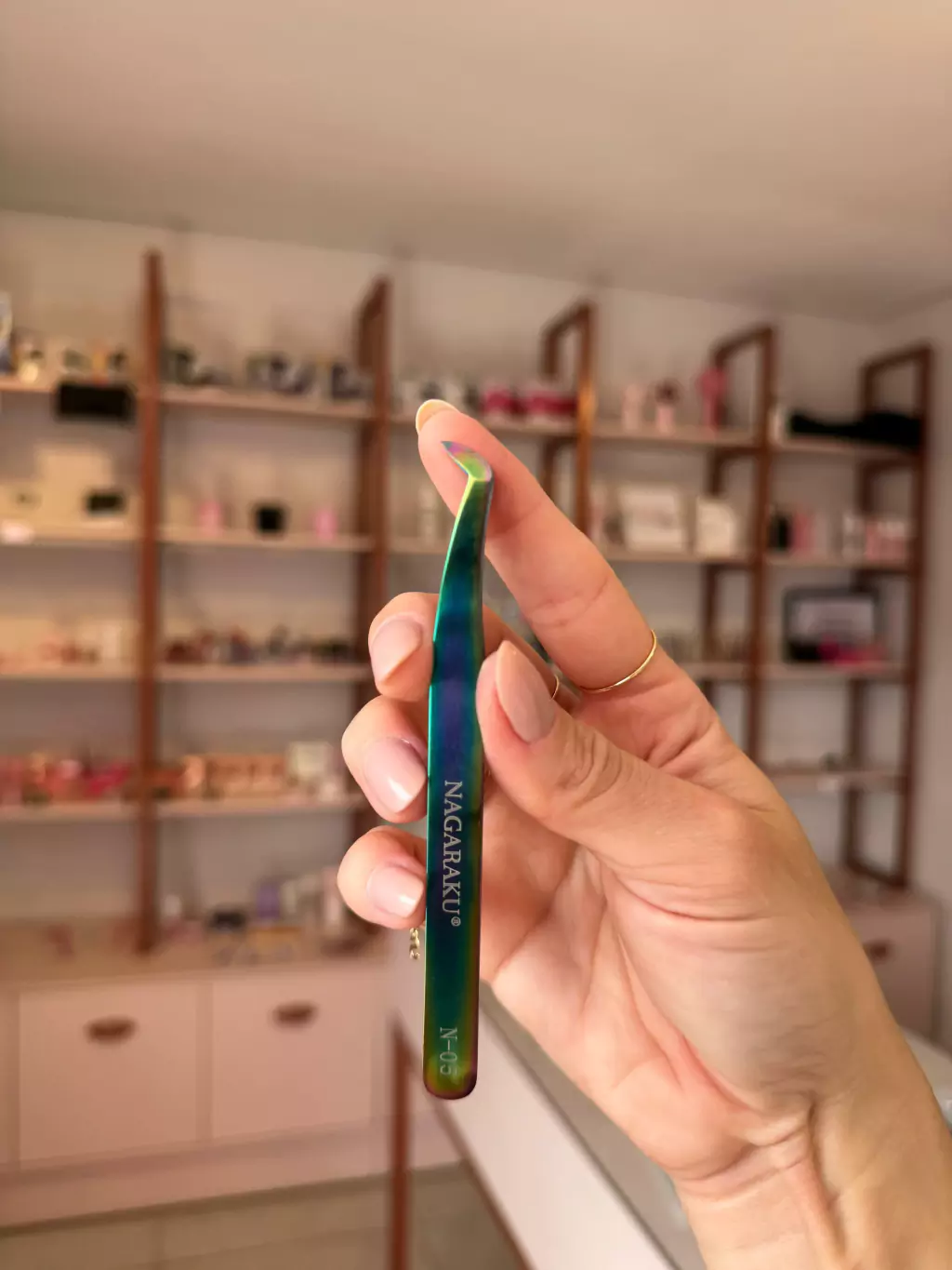 A Pinça N05 auxilia na montagem de fans e pode ser usada para aplicação (adaptação da profissional).