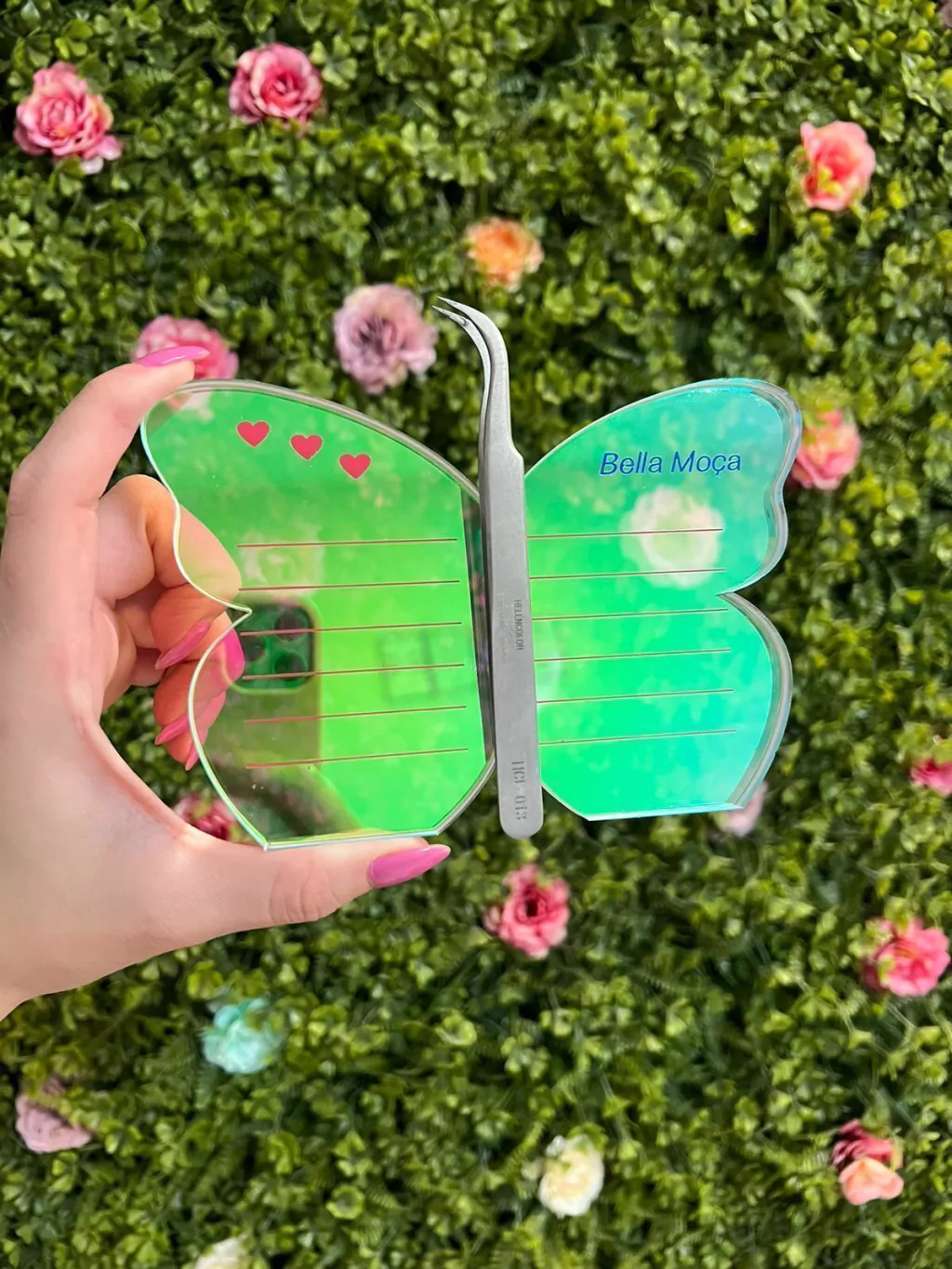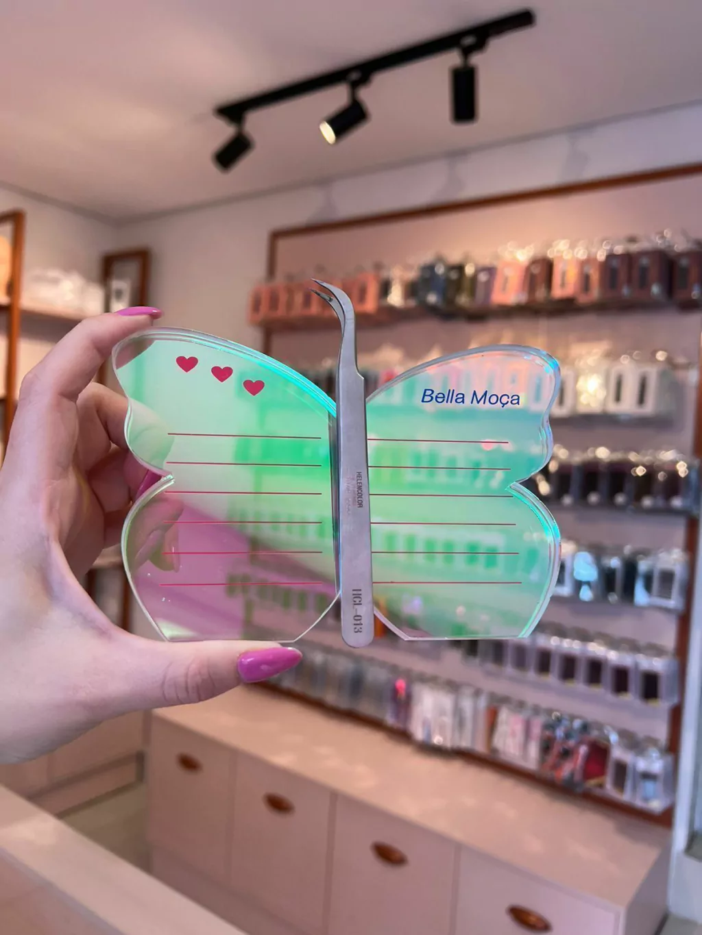 Placa de acrílico formato borboleta para colocar chicotes e tem ímã para colocar a pinça