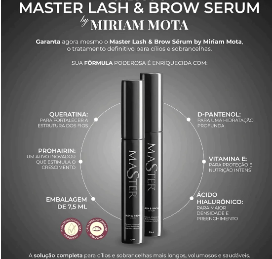 O Sérum Master Lash & Brow foi desenvolvido para fortalecer, nutrir e hidratar os fios de cílios e sobrancelhas, promovendo aspecto mais cheio, saudável e definido. Assinado por Miriam Mota, especialista em embelezamento do olhar, reúne ativos consagrados para cuidado diário e resultados consistentes.