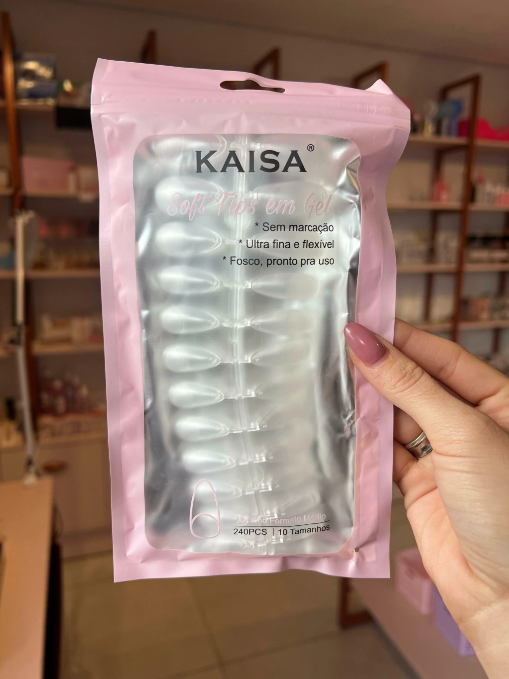 Postiça Soft Gel Almond Médio Kaisa com 240 peças para um visual sofisticado. Fácil aplicação, alta resistência e acabamento profissional. Perfeita para quem busca unhas impecáveis e práticas para o dia a dia ou salão.