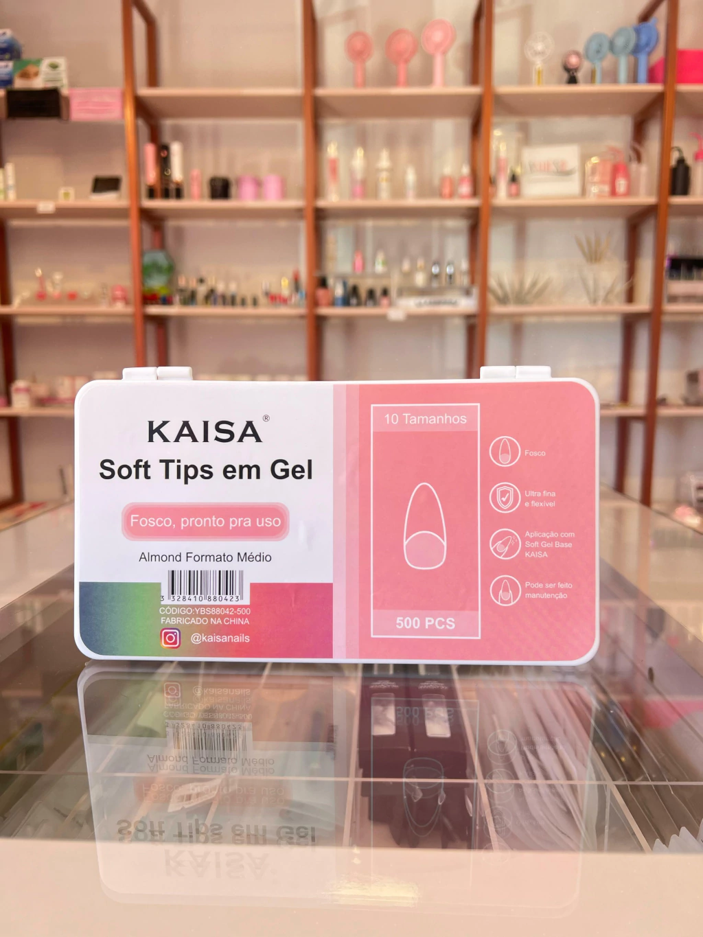 Postiça Soft Gel Almond Médio Kaisa com 500 peças para um visual sofisticado. Fácil aplicação, alta resistência e acabamento profissional. Perfeita para quem busca unhas impecáveis e práticas para o dia a dia ou salão.
